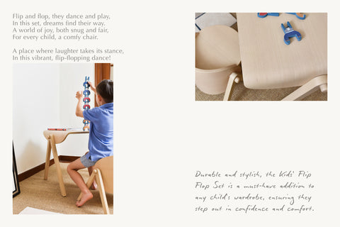 Introducing our Flip Flop Chair, a perfect seating solution for your child's space. Crafted from all-natural wood, this chair offers flexibility and adaptability to accommodate your child's needs. The adjustable design ensures a comfortable and ergonomic seating position for various activities, whether it's reading, drawing, or enjoying playtime.