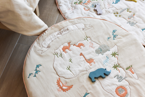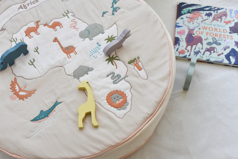 与非洲圆形地板垫「探险家」一起踏上狂野的冒险之旅。这款迷人的靠垫上绘有生动的非洲地图及其迷人的野生动物,为年轻的探险家提供安慰和灵感。